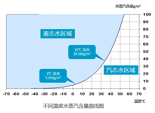 आकृती दाखवते की हवेत वेगवेगळ्या तापमानात पाण्याची वाफ वेगवेगळ्या प्रमाणात असते. हवा थंड होते आणि पाण्याची बाष्प पातळीही खाली जाते. वक्र बिंदू आहेत जे संतृप्त पाण्याची वाफ पातळी चिन्हांकित करतात. या प्रत्येक बिंदूचे तापमान दवबिंदू आहे. कमी दवबिंदू म्हणजे संकुचित हवेत पाण्याची वाफ कमी होते. रेफ्रिजरेटेड एअर ड्रायर्स हा भौतिक नियम वापरतात. ते रेफ्रिजरंटसह कॉम्प्रेस्ड एअर स्वॅप उष्णता देतात. ही क्रिया संकुचित हवेचे तापमान खाली आणते. थंड हवेच्या पाण्याची वाफ द्रव पाण्यात बदलते. हे द्रव प्रणालीतून बाहेर काढून टाकले जाते. उदाहरणार्थ, संकुचित हवेतील संतृप्त पाण्याची बाष्प सामग्री 35℃ वर 39.286 g/m³ आहे. रेफ्रिजरंटसह उष्णतेची देवाणघेवाण केल्यानंतर आणि 3℃ पर्यंत थंड झाल्यावर, संतृप्त पाण्याची वाफ सामग्री 5.953g /m³ असते. 33.333g /m³ चा फरक फ्रीझ ड्रायरद्वारे थंड झाल्यावर आणि निर्जलीकरणानंतर काढलेल्या पाण्याचे प्रमाण दर्शवतो. म्हणजे, संकुचित हवा फ्रीझ ड्रायरमधून गेल्यानंतर, अंदाजे 85% ओलावा काढून टाकला जातो, ज्यामुळे संकुचित हवा कोरडे होणे उत्पादन प्रक्रियेच्या आवश्यकता पूर्ण करते.