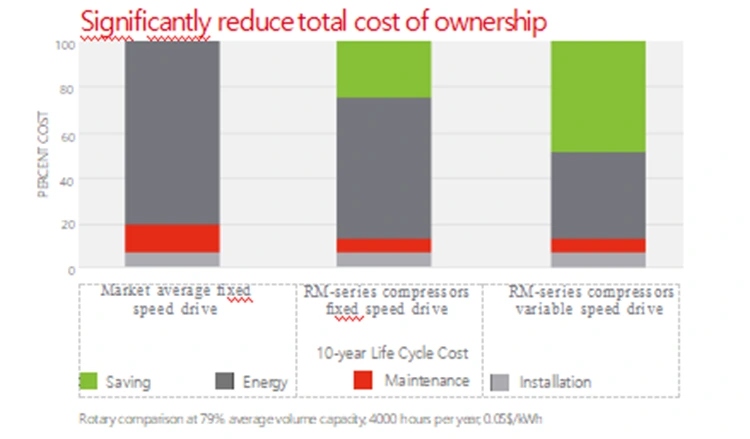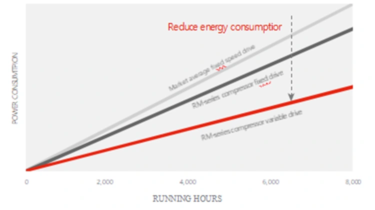 प्रत्येक RM मालिका एअर कॉम्प्रेसर अगदी नवीन, उच्च-कार्यक्षमतेच्या मुख्य युनिटसह सुसज्ज आहे, एक IE3 निश्चित-स्पीड मोटर आणि ECO*-PM VSD IE5 व्हेरिएबल-फ्रिक्वेंसी मोटर तंत्रज्ञान एकत्र करून, तुम्हाला ऊर्जा खर्चावर 12-30% पर्यंत बचत करण्यास मदत करते.